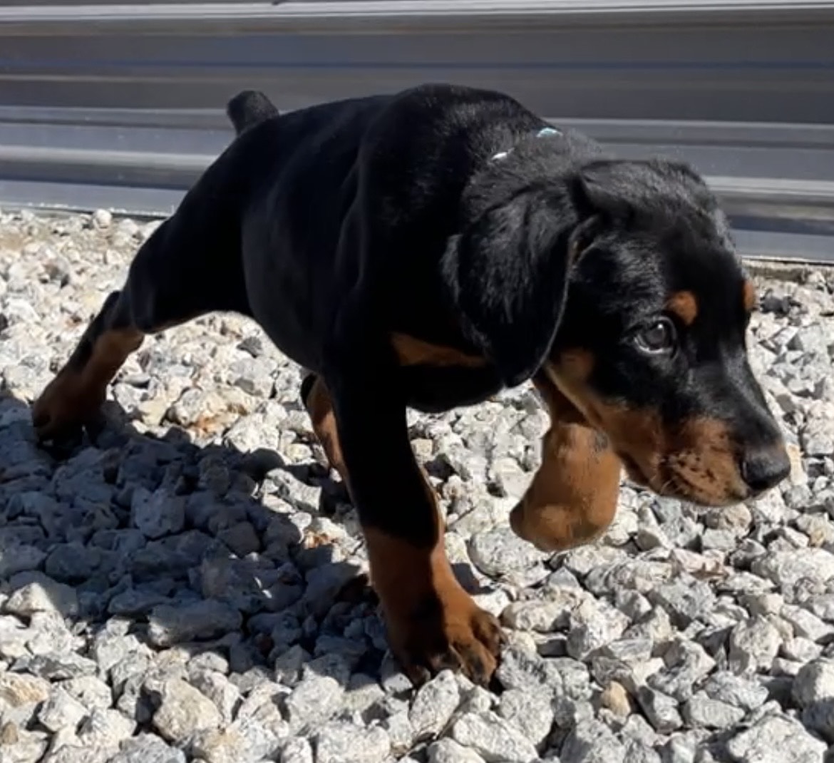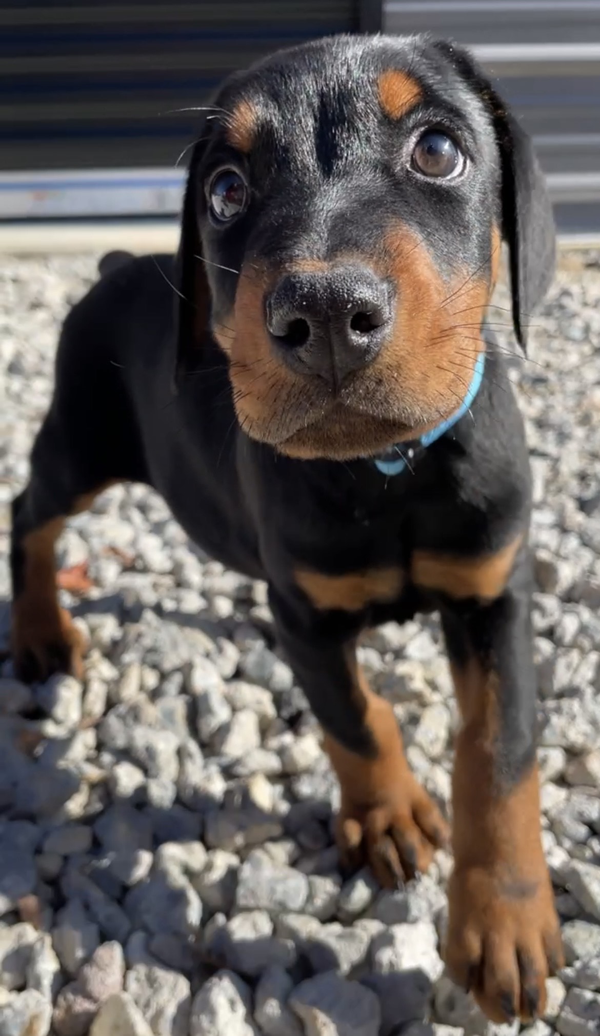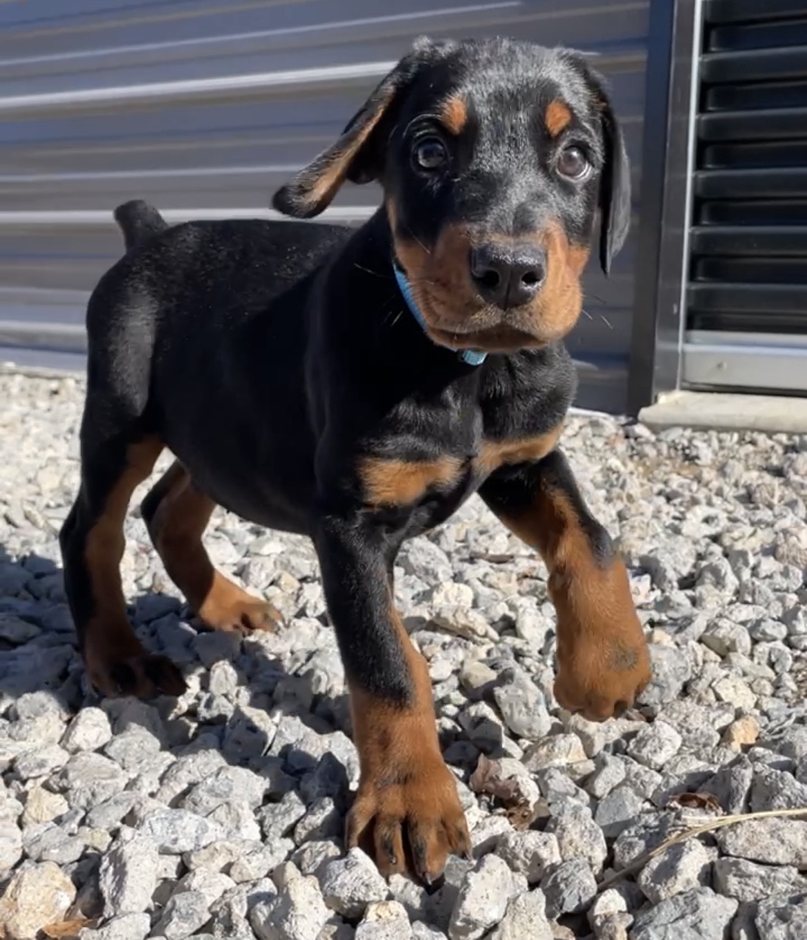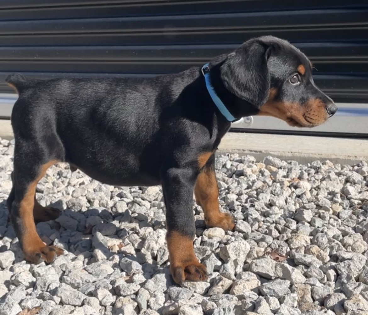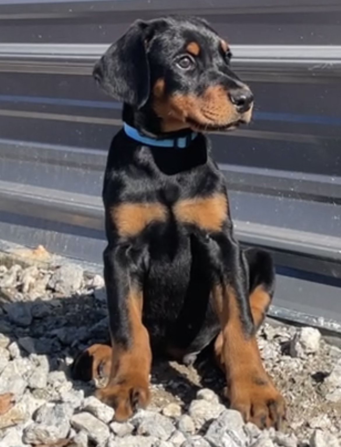 This handsome boy weighs 14 pounds. He is a pure European male Doberman with black and rust coloring. He loves to jump around and play with his older brother, but do not get confused. He also enjoys a good nap after playtime and meals. And be prepared to be showered in kisses, because he is a lover! Last but not least, he is so smart! In fact, he already knows basic cues such as sit and come. For more information, please give us a call or fill out the form under “Contact Us” and we will be sure to answer any questions you may have.