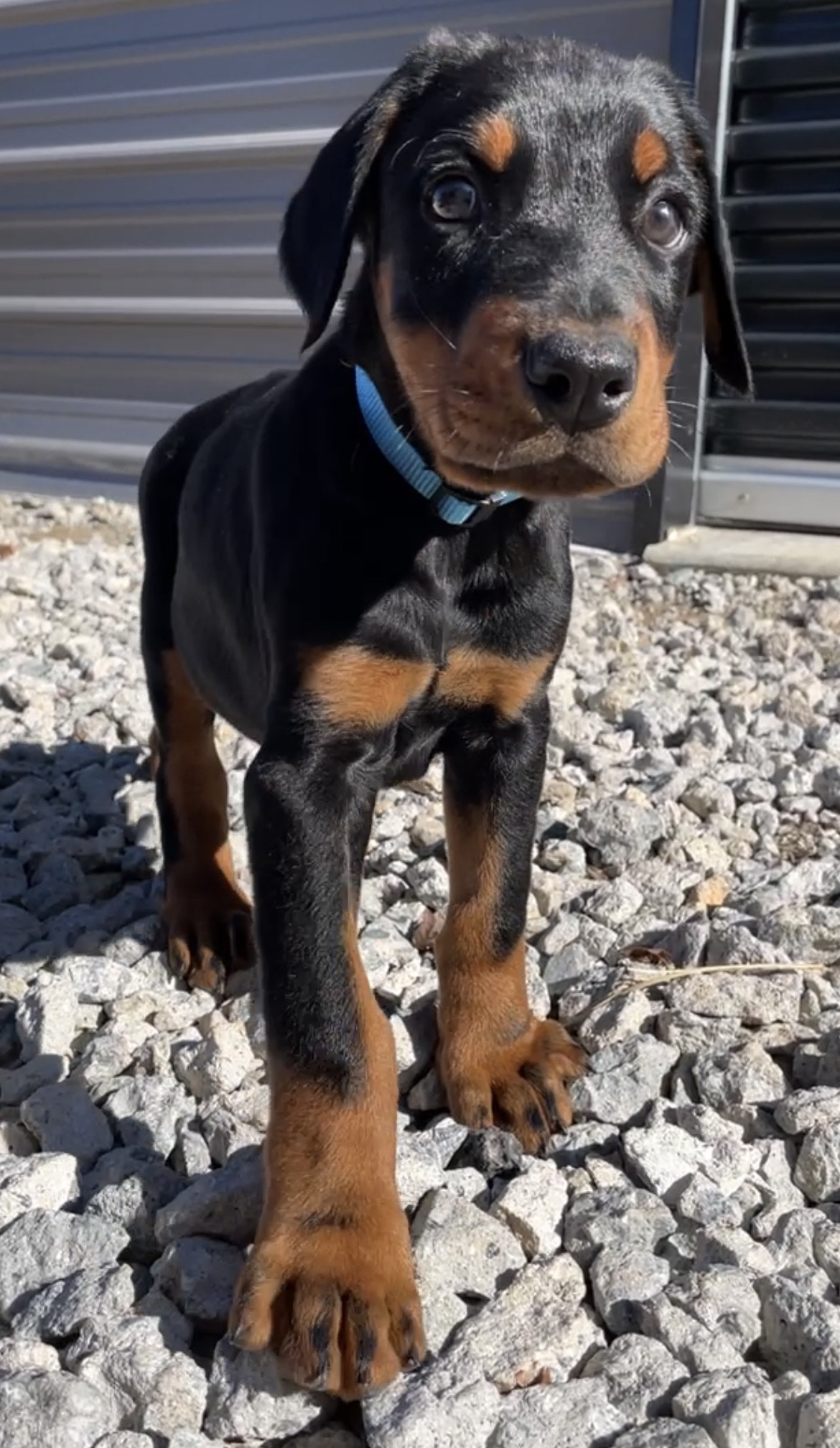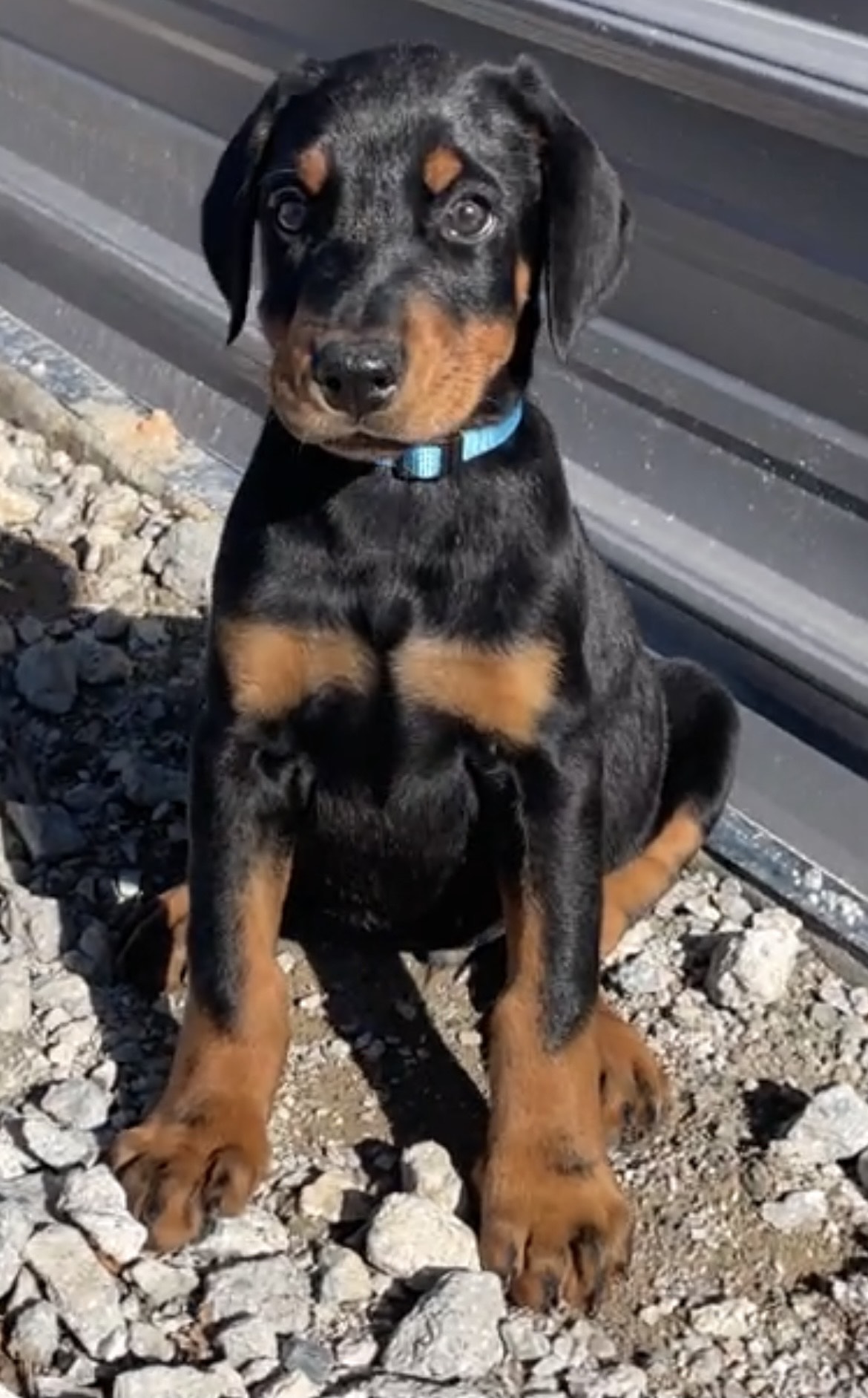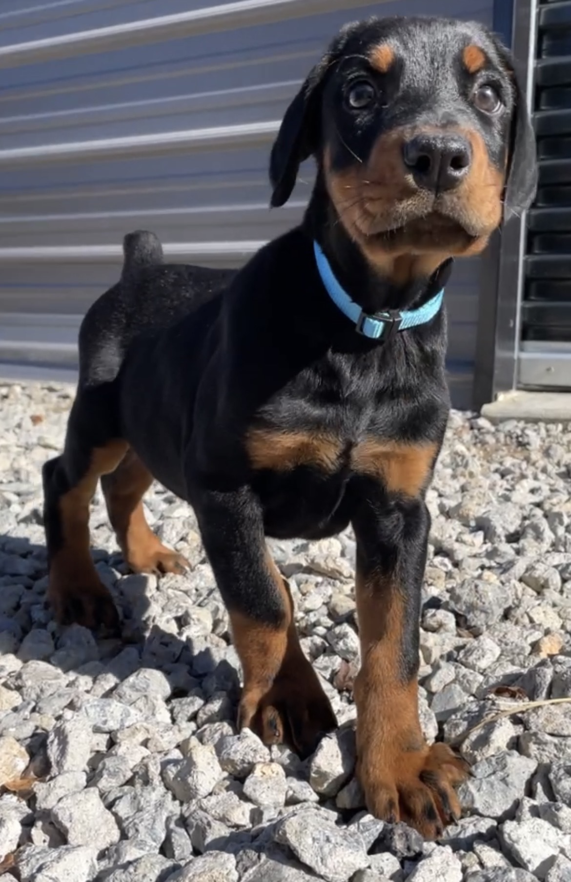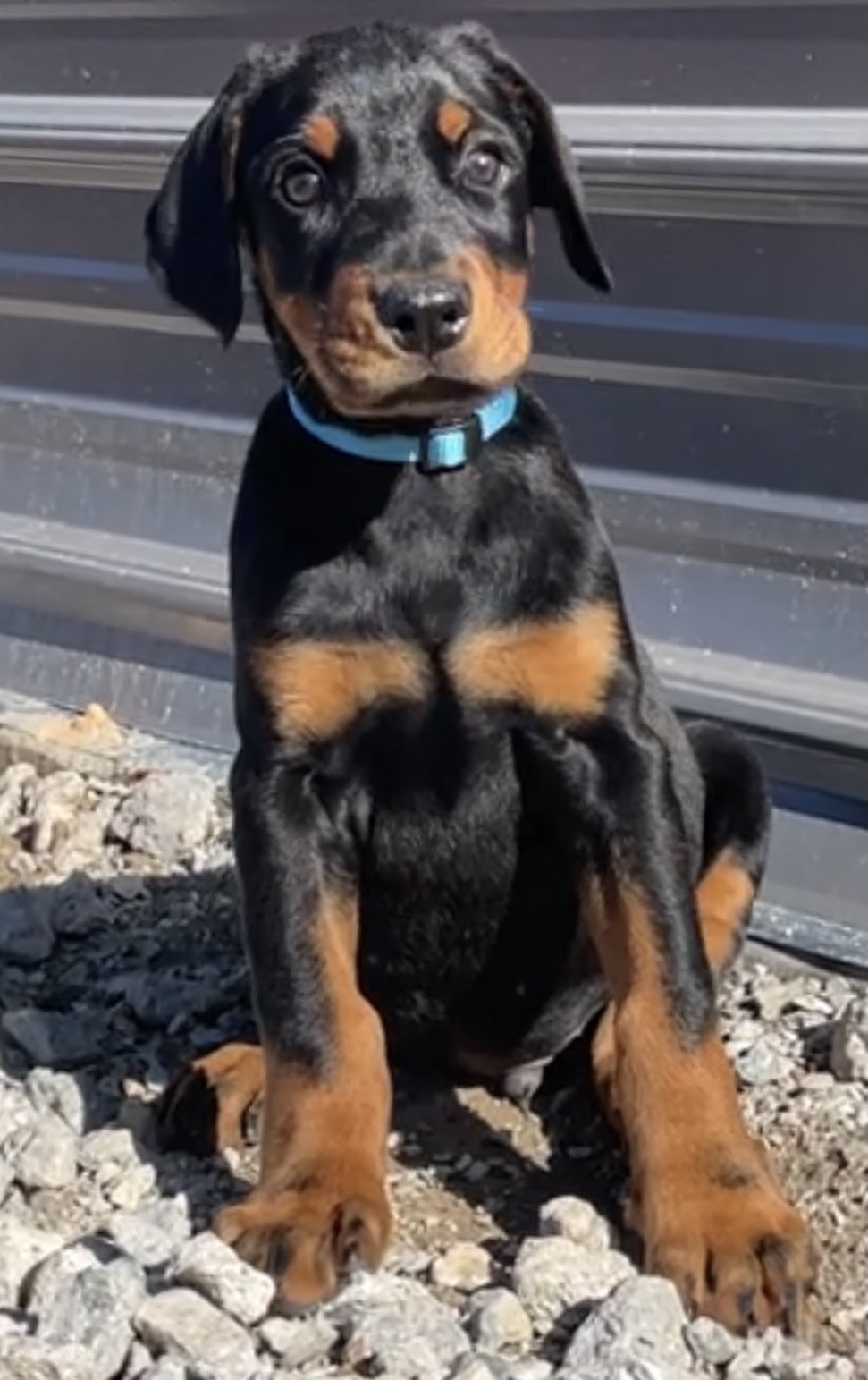 This handsome boy weighs 14 pounds. He is a pure European male Doberman with black and rust coloring. He loves to jump around and play with his older brother, but do not get confused. He also enjoys a good nap after playtime and meals. And be prepared to be showered in kisses, because he is a lover! Last but not least, he is so smart! In fact, he already knows basic cues such as sit and come. For more information, please give us a call or fill out the form under “Contact Us” and we will be sure to answer any questions you may have.